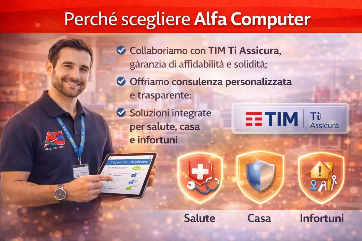 Con Alfa Computer puoi oggi affidarti a un partner unico non solo per la comunicazione e l’energia, ma anche per la protezione personale e patrimoniale, grazie alla collaborazione con TIM Ti Assicura.