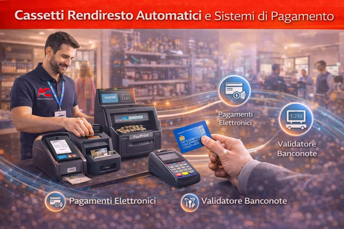 Per garantire maggiore sicurezza e velocità nelle operazioni di cassa, Alfa Computer fornisce cassetti rendiresto automatici VNE e PayPrint, soluzioni tecnologiche avanzate che riducono errori e rischi, migliorando la gestione del denaro contante.