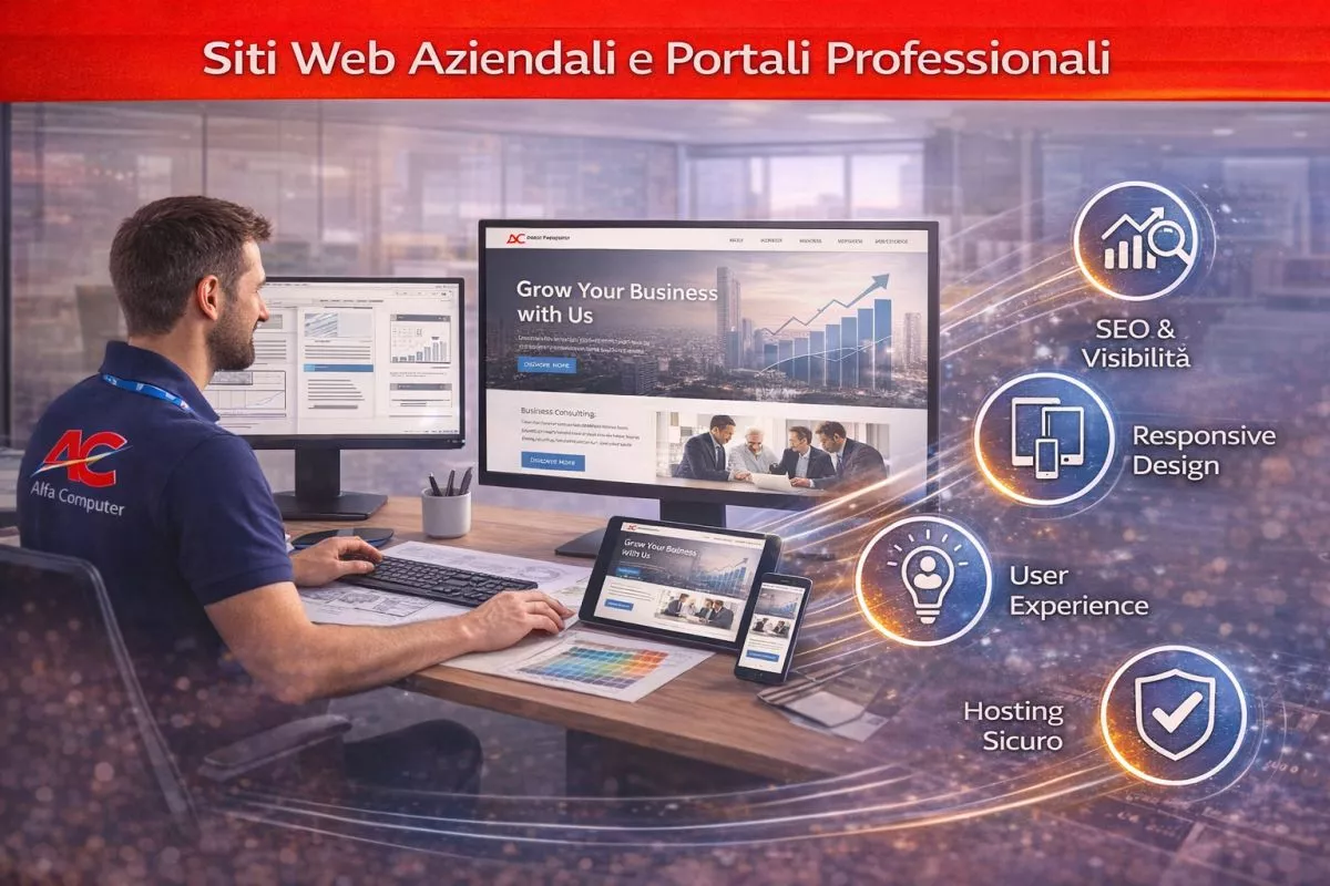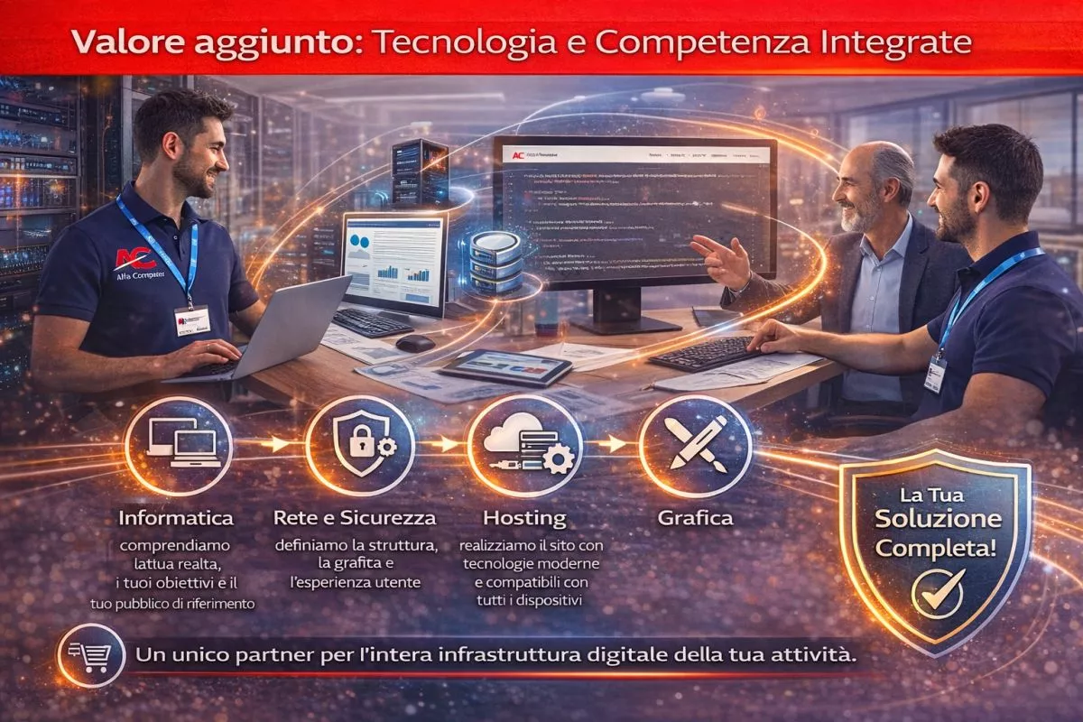 Il vantaggio di affidarsi ad Alfa Computer è nella nostra visione completa: uniamo competenze informatiche, conoscenze di rete, sicurezza, hosting e grafica per garantire stabilità, protezione e risultati concreti.